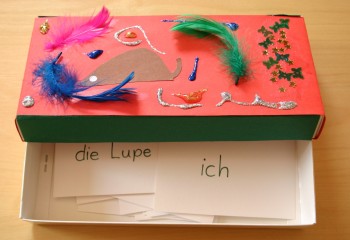 Im 1. Schuljahr geht es zunächst darum, Wörter zu sammeln. Das Buch Buch "Frederik" von Leo Lionni bietet einen guten Einstieg, sammelt Frederik doch auch Wörter. Die Kinder sammeln "Lieblingswörter" aus ihren eigenen Texten, schreiben sie auf Kärtchen und legen sie - korrigiert - in das sogenannte "Wörterschatzkästchen" (s. Foto oben).