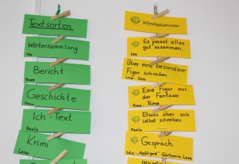 Gedanken, Krimi, Liebesgeschichte, Sachtext, Aufruf ... Die so herausgefundenen Textsorten werden auf grüne Karten notiert und im Klassenraum ausgehängt. Später werden Schreibgeheimnisse den Textsorten zugeordnet und noch später Textsorten nach übergeordneten Textmustern (erzählend, informierend z.B.) systematisiert (rote Karten). So entsteht durch die Arbeit an den eigenen Texten – ohne die klassischen Auftragstexte – ein umfangreiches Textsortenwissen.