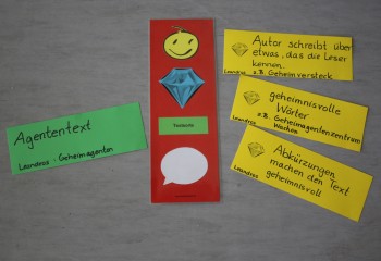Es sind Fragen nach den Geheimnissen eines Textes, nach „Schreibgeheimnissen". Auf Fahrplan 2 sind sie durch einen Diamanten dargestellt. Schreibgeheimnisse gemeinsam zu finden und zu formulieren, ist die Herausforderung des gemeinsamen Gesprächs schlechthin. Sie werden auf gelbe Karten notiert und im Klassenraum aufgehängt.