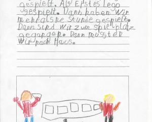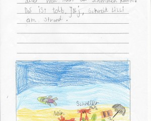 In den letzten Wochen des 1. Schuljahres laufen die Vorbereitungen für die erste Buchveröffentlichung der Klasse. Jedes Kind sucht dafür den seiner Meinung nach besten Text aus dem eigenen Tagebuch aus. Diese Texte kopiere ich, um in die Kopie die korrekte Schreibweise mit einem bunten Stift zu notieren. Manchmal ist es das erste Mal, dass die Kinder einen Text ordentlich auf einen besonderen Bogen abschreiben. Für eine Veröffentlichung muss der Text nicht nur so ordentlich wie möglich, sondern auch so geschrieben werden, dass andere ihn gut lesen können - also in der "Erwachsenenschrift" und nicht mehr in "Privatschreibung". Damit er möglichst alle anspricht, zeichnen die Kinder zum Text ein passendes Bild.