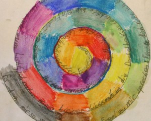 Ihre Eindrücke schreiben die Kinder mit Bleistift in eine Spirale auf einem quadratischen Blatt (Download s.u.). Später kolorieren sie ihren Text mit wasserlöslichen Bunt- bzw. Wachsstiften und gestalten daraus mit Pinsel und (wenig) Wasser ein Aquarell. So entstehen kleine Kunstwerke, die sich – auf schwarzem Hintergrund in einem einfachen Rahmen gefasst – auch als ganz persönliche Weihnachtsgeschenke eignen.