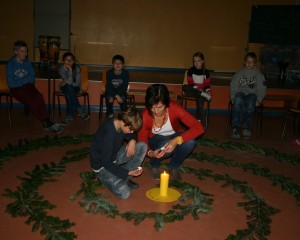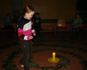 Der Raum ist ganz verdunkelt. In der Mitte brennt eine Kerze. Der Weg dorthin führt durch eine aus Tannenzweigen gelegte Spirale. Weihnachtliche – klassische – Musik ertönt im Hintergrund. Mit einem Teelicht in der Hand geht jedes Kind still den Weg vom Dunklen ins Helle. In der Mitte verharrt es vor der leuchtenden Kerze, nimmt sich von dem Licht
